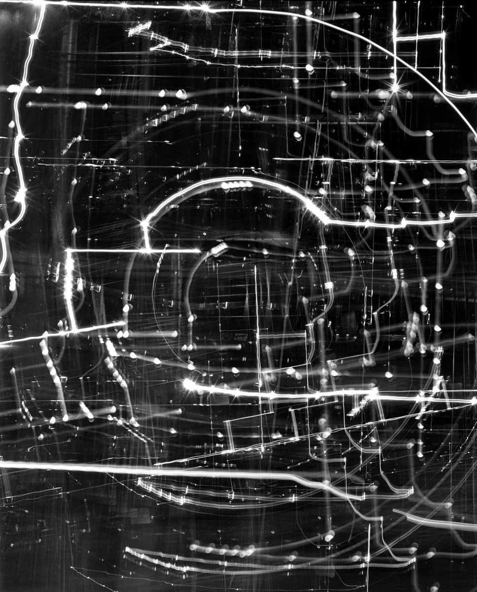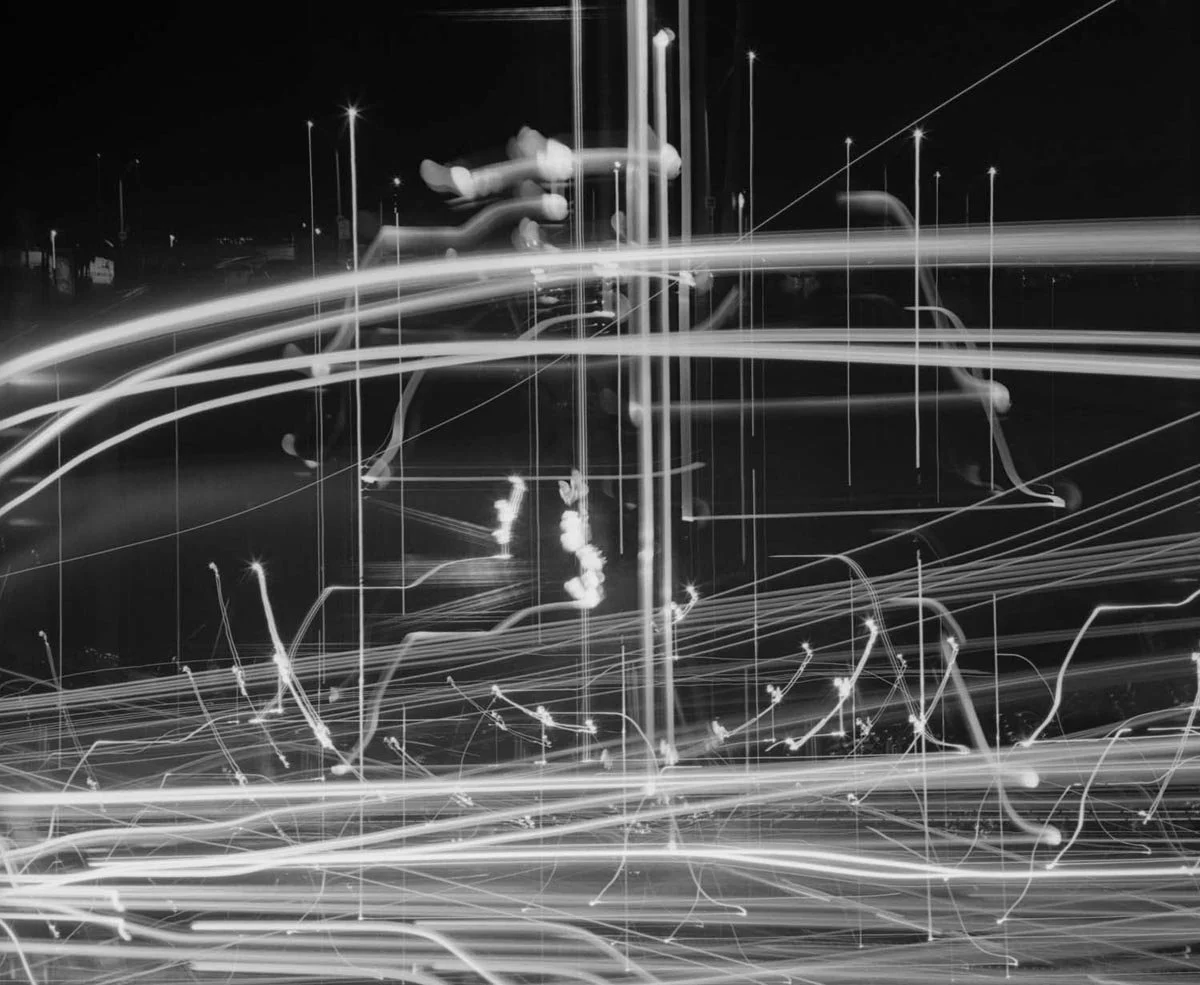 In my images one will find themself immersed in a seemingly chaotic space of dots and lines all created at night around busy intersections. Our world at night lends itself to the camera, allowing me to show aspects of it that are imperceptible to the naked eye and evident only when the film develops. The conversation that happens between the photograph and photographed creates a fascinating tension.